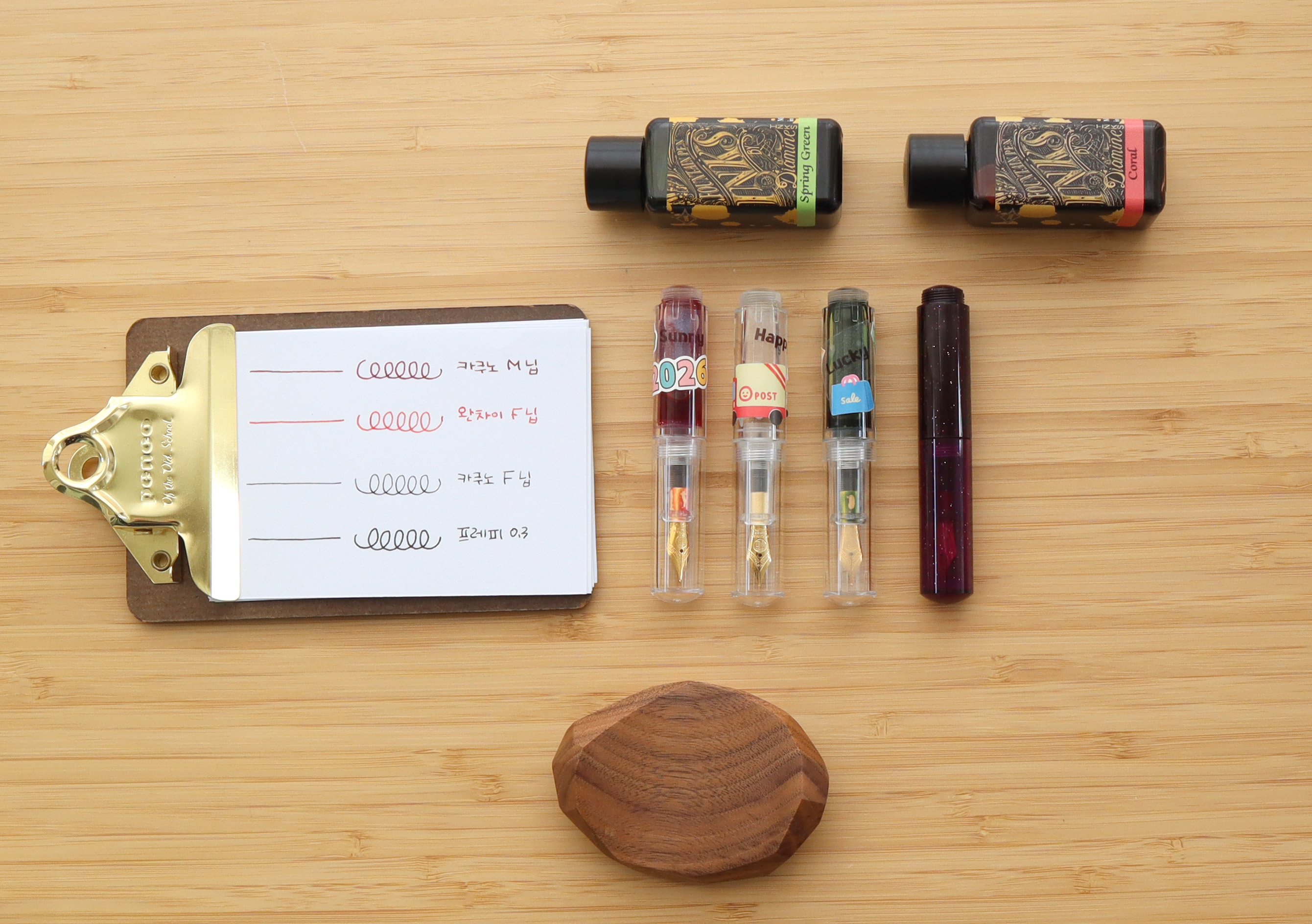 저는 4자루 모두 F닙을 구매했습니다. 각각 이름에 맞는 잉크를 넣어줬고요. 럭키에는 '디아민 스프링 그린'을 넣었습니다. 써니는 디아민 펄잉크 '레드 스카이'를 넣었어요.