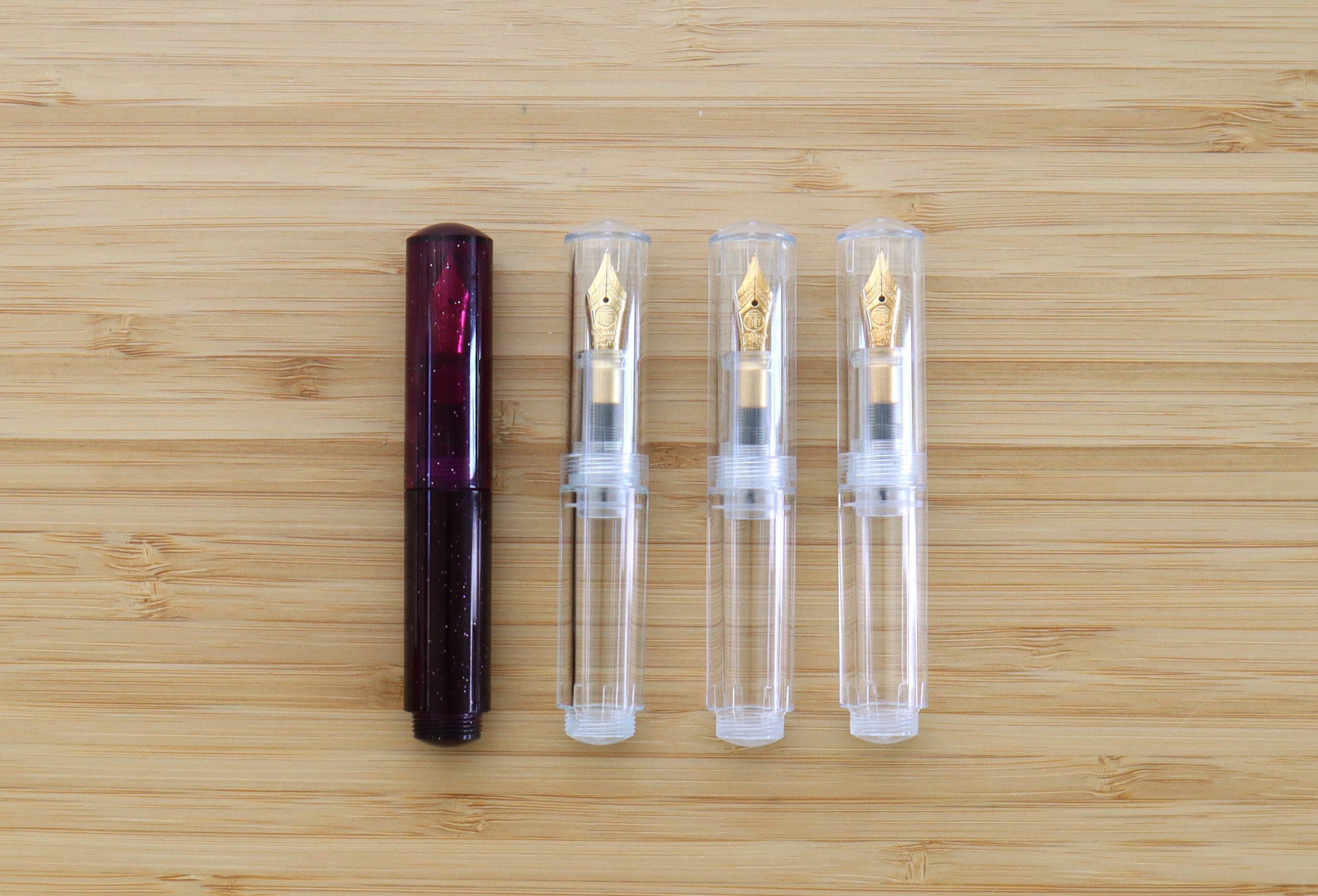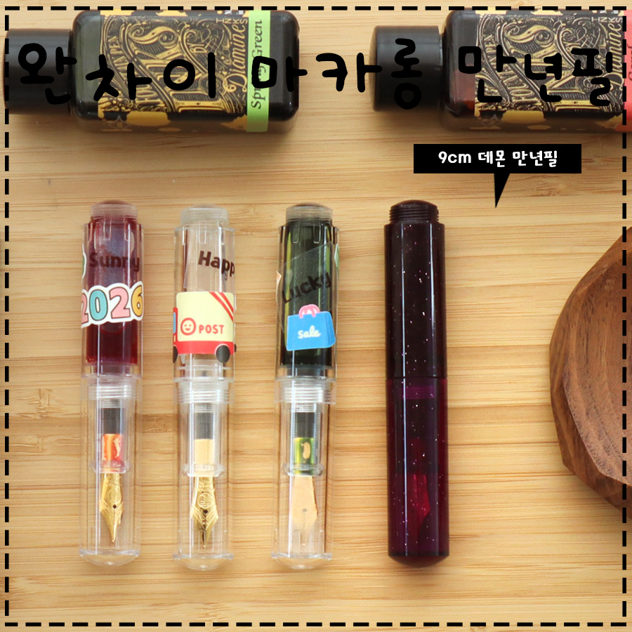 평소 눈여겨보던 마존(문맨) 완차이 미니 만년필을 최근에 구매했습니다. 투명한 데몬 3자루와 퍼플 모델까지, 총 4자루를 한꺼번에 데려왔어요. 저는 '잉크 놀이'를 위해 구입했는데, 문맨 완차이 만년필은 펜 몸체 전체를 잉크 저장고로 쓰는 '아이드로퍼' 방식이라, 배럴 안에 담긴 잉크 색상을 직관적으로 감상할 수 있는 장점이 있습니다.