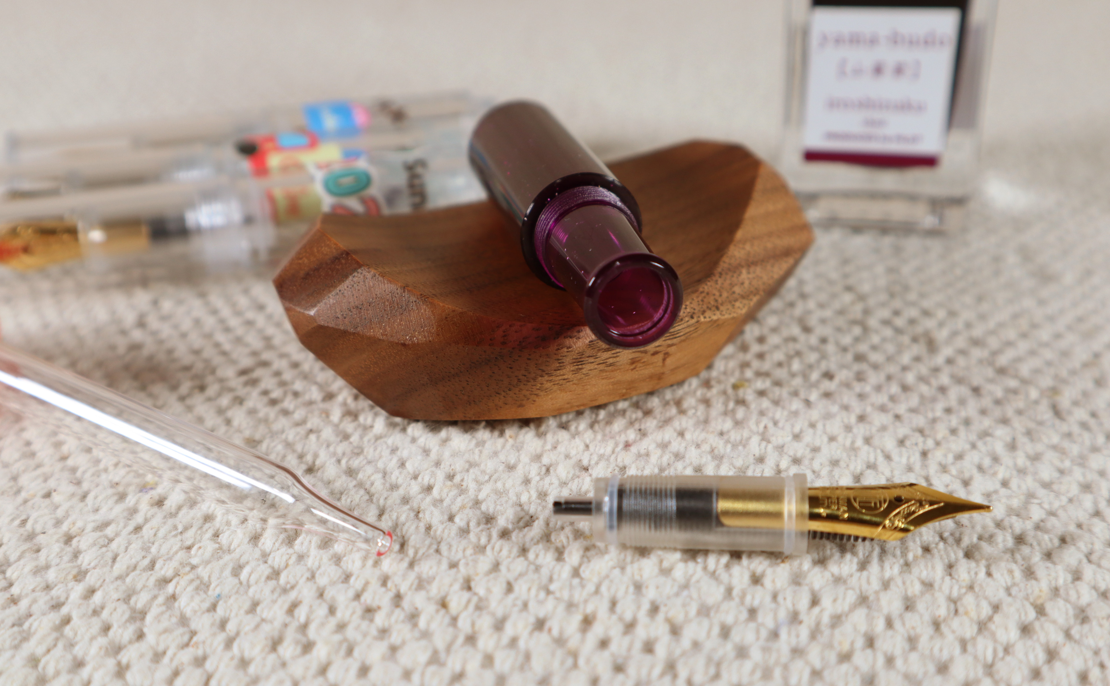 완차이 만년필을 구매하면 제법 괜찮은 퀄리티의 스포이드를 함께 줍니다. 저는 촬영한다고 펜촉을 열어버렸는데, 배럴 중앙을 열어서 충전하시면 됩니다. 물론 저처럼 펜촉을 뽑아서 잉크를 넣어줘도 문제는 없었어요.