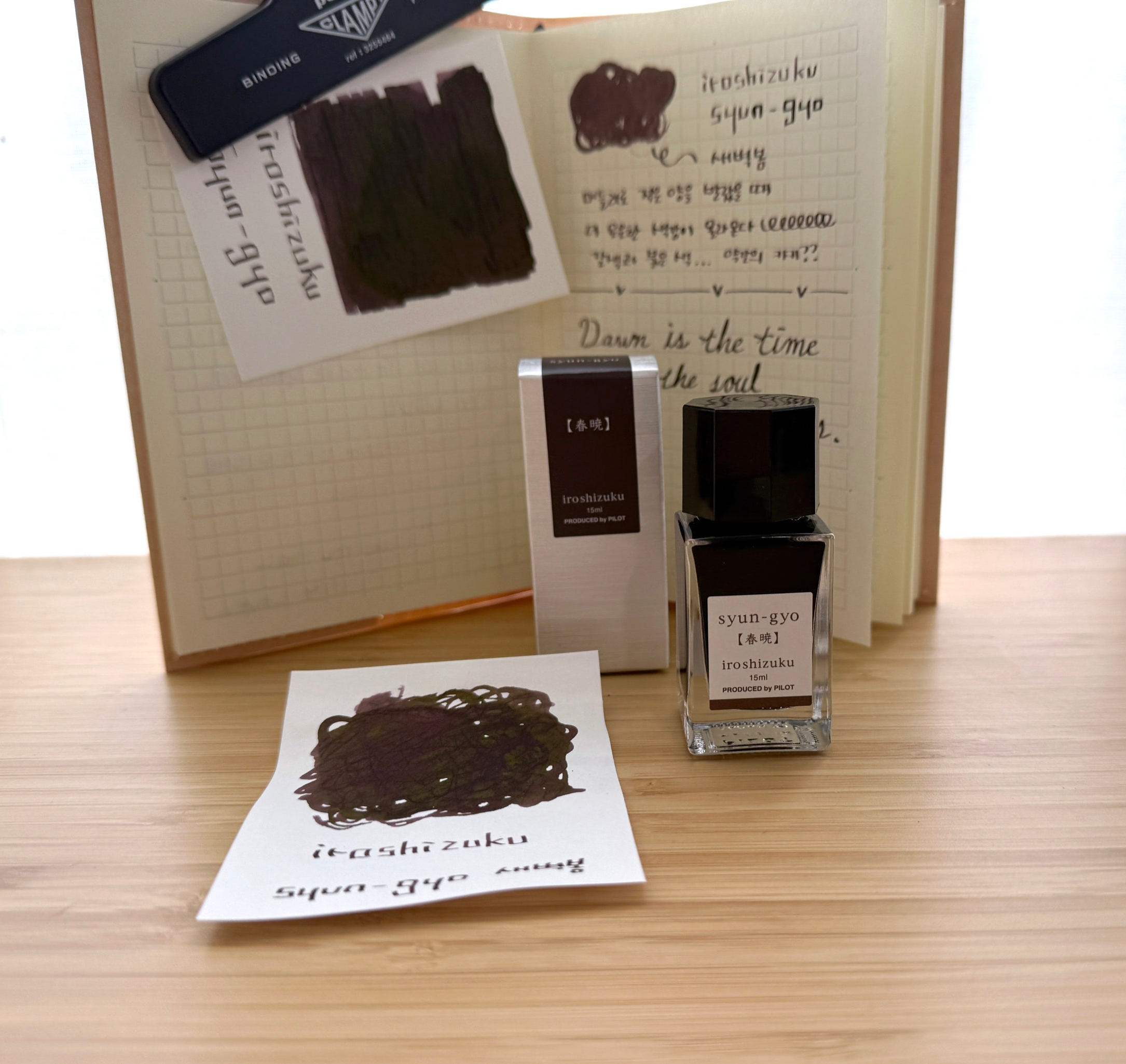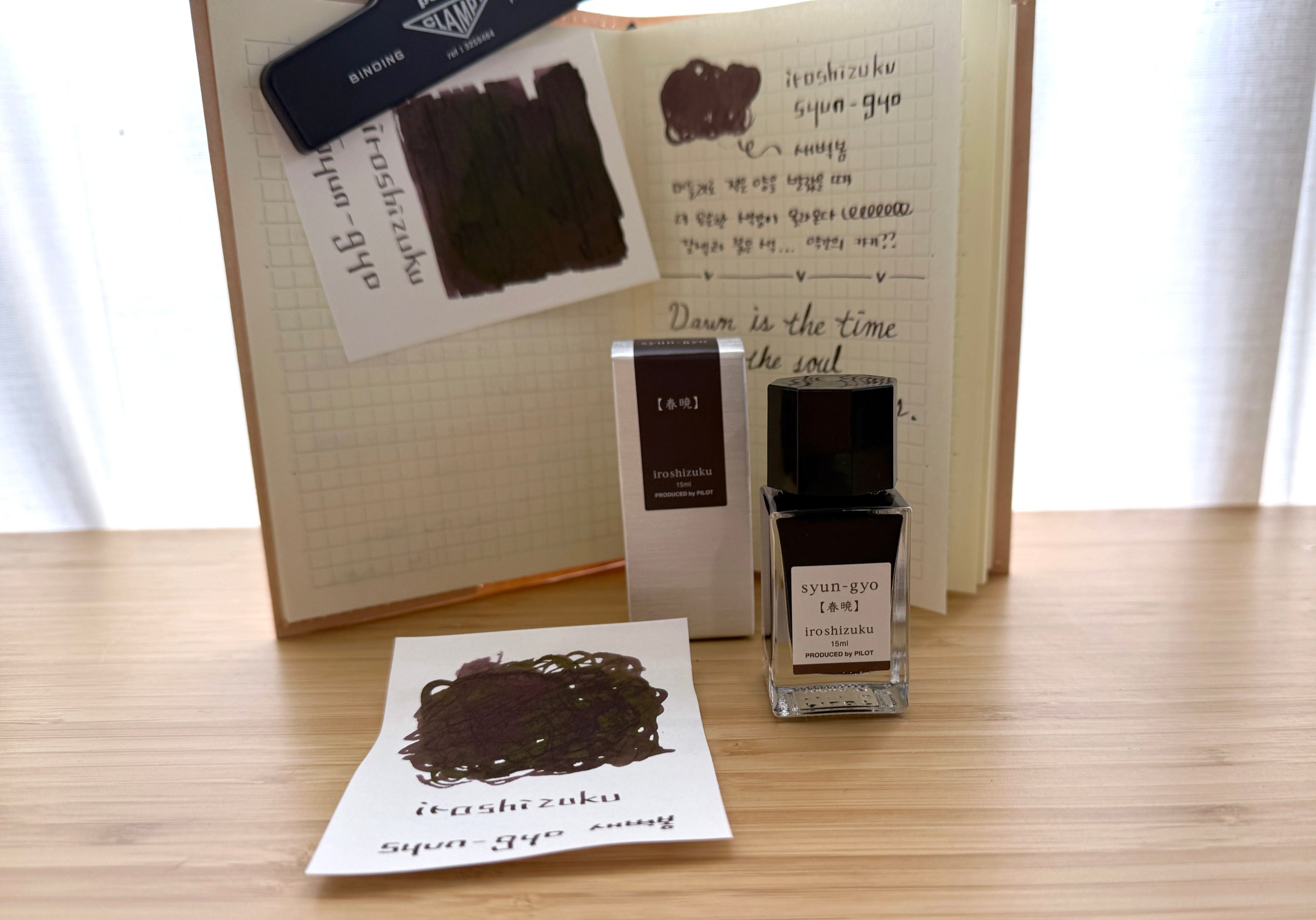 이 잉크는 '봄날 새벽의 희미한 붉은 빛'을 테마로 하는 이로시주쿠의 새 컬러입니다. 딥 그레이프나 와인레드처럼 보이다가도 마르면 짙은 '레드 브라운'으로 변하는 색상입니다. 종이에 따라 약간 달라지긴 하지만 '빈티지한 세피아 브라운'이라고 보면 될 거 같아요.