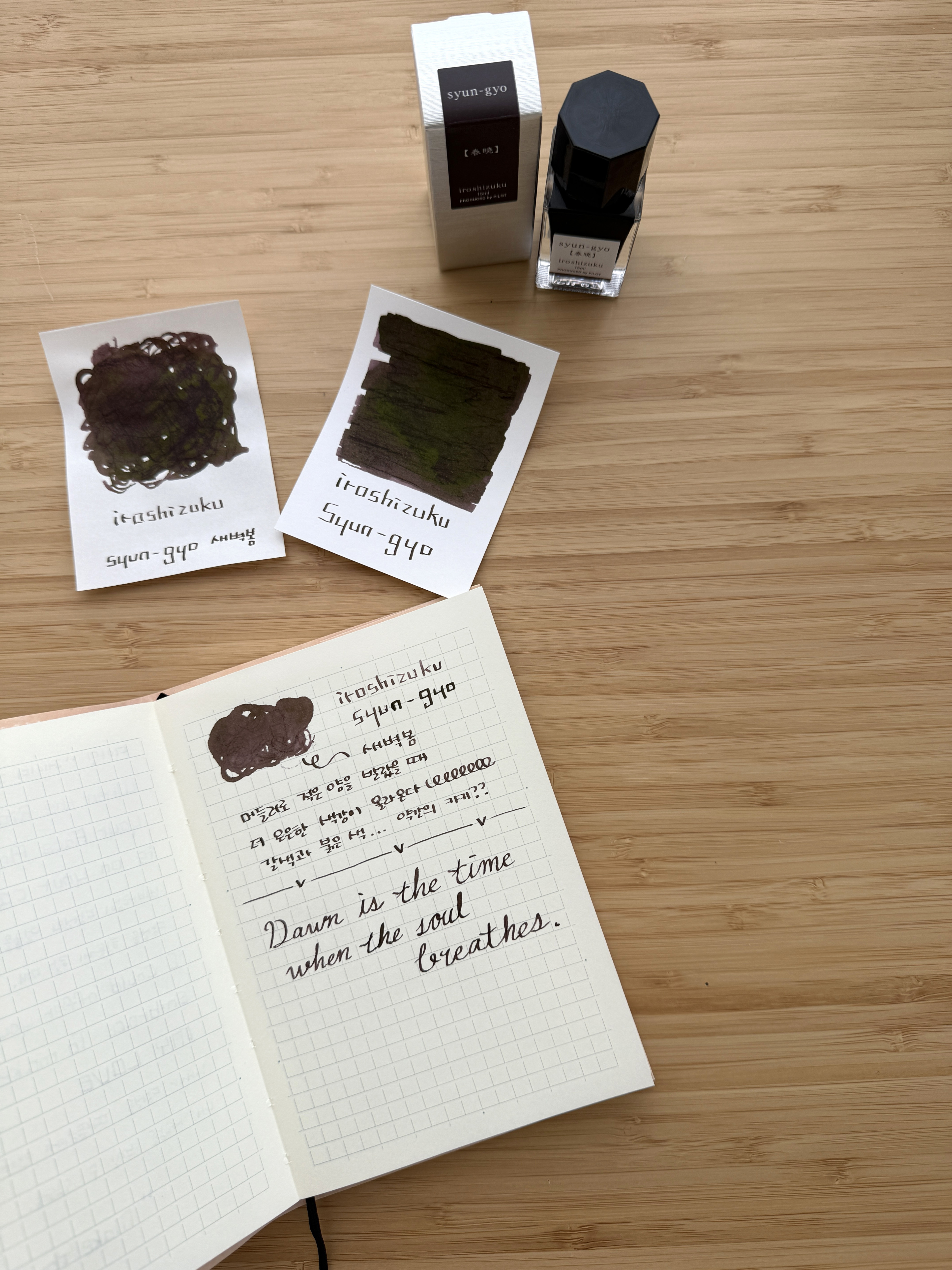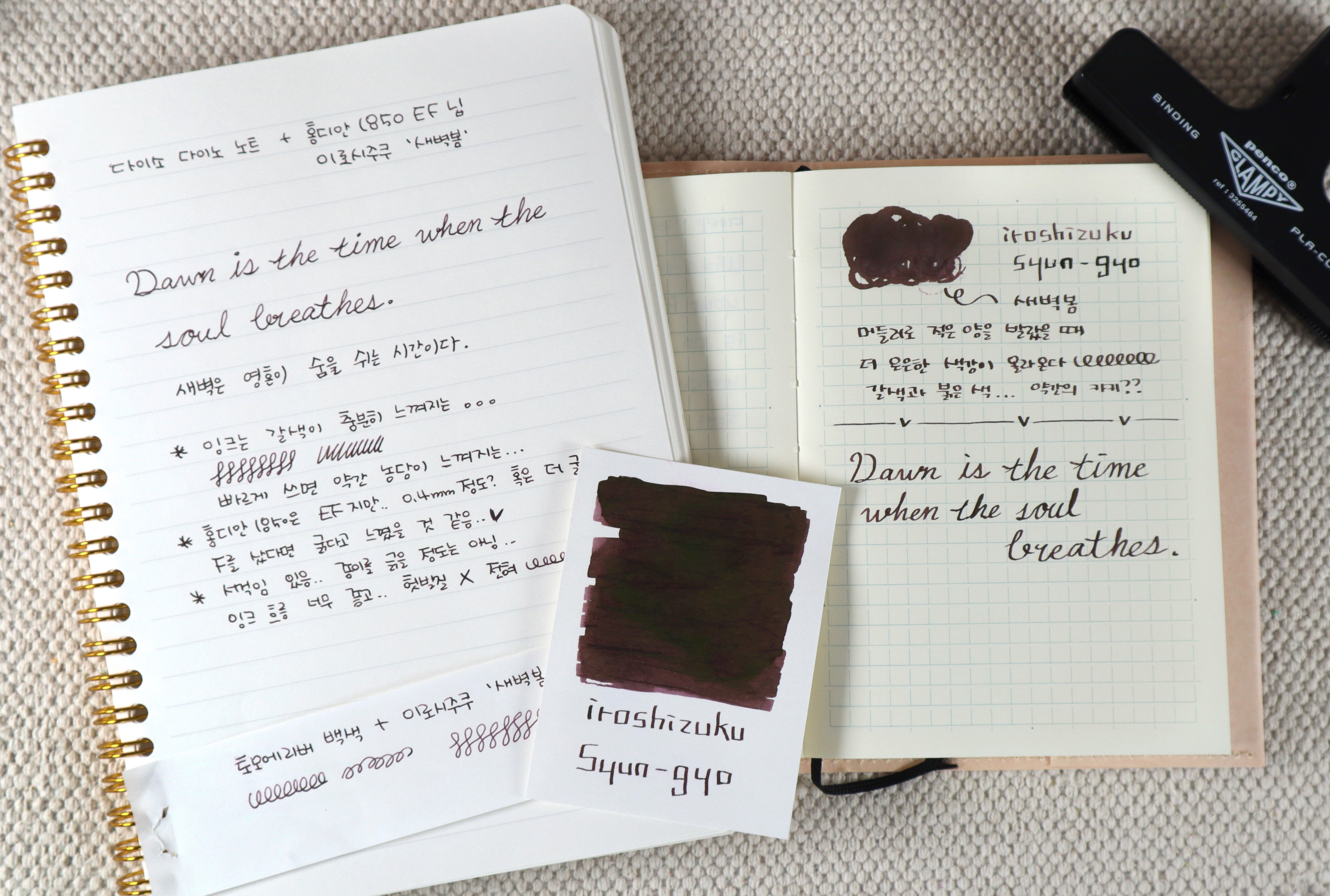 미도리 MD노트에 딥펜으로 시필했을 때, 진하게 눌린 부분에서는 녹색의 광택을 살짝살짝 엿볼 수 있어요. 하지만 전체적으로 브라운과 녹색이 올라오는 건 아니라서 아쉬웠고요. 딱 봤을 때는 갈색 베이스에 20% 붉은색이 섞인 느낌이었습니다. 만년필에 넣어서 시필은 다이노 노트를 사용했는데 그냥 갈색이 충분히 느껴지는 색상이었어요. 갈색에 15% 붉은색이 섞인 느낌이라고 해야 할까요? 제가 세필에 가까운 닙에 사용했기 때문일 수도 있지만 색상의 깊이나 농담이 느껴지진 않았습니다. 일반 종이에 만년필로 사용하신다면 갈색에 가까운 발색을 보실 수 있을 것 같아요.