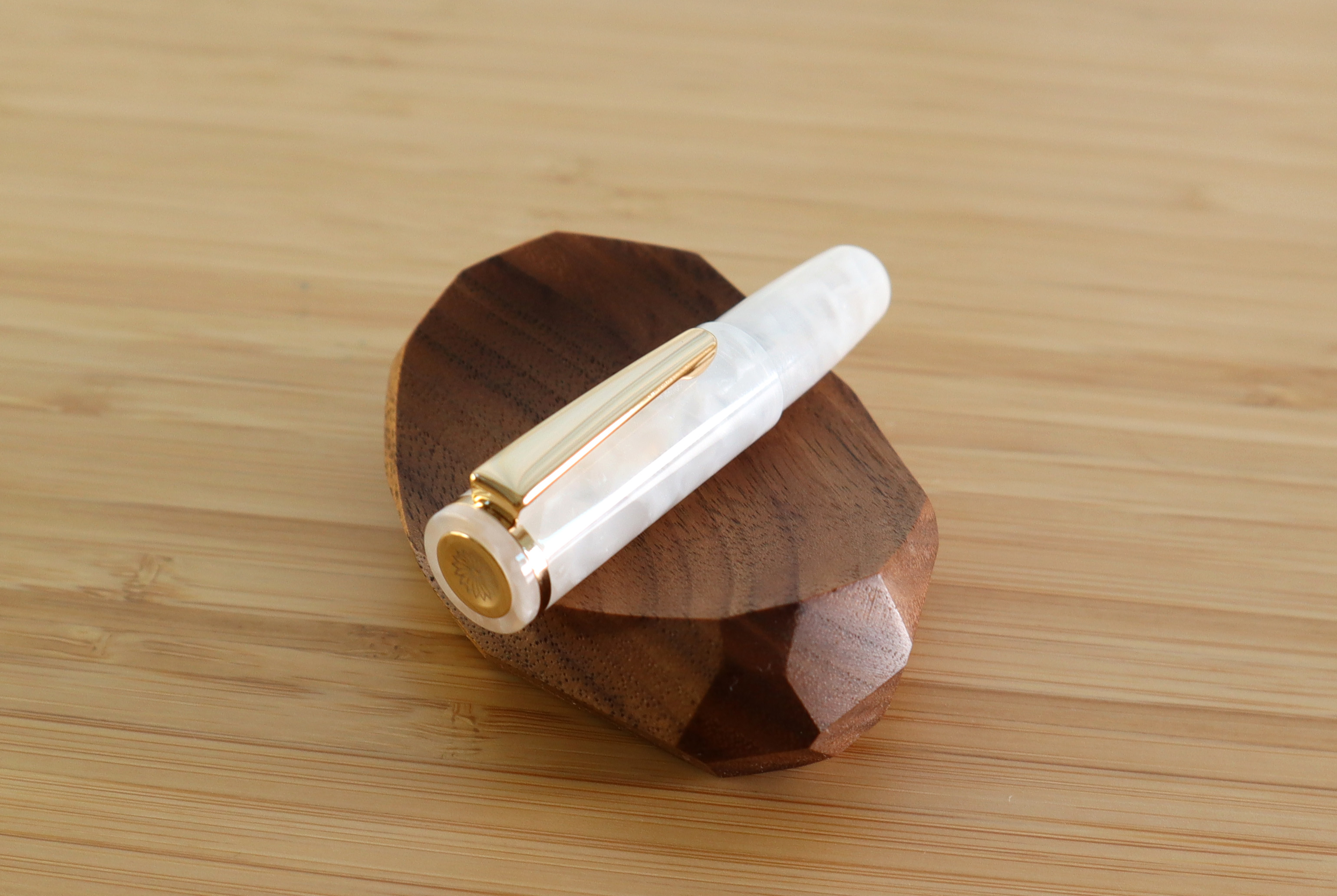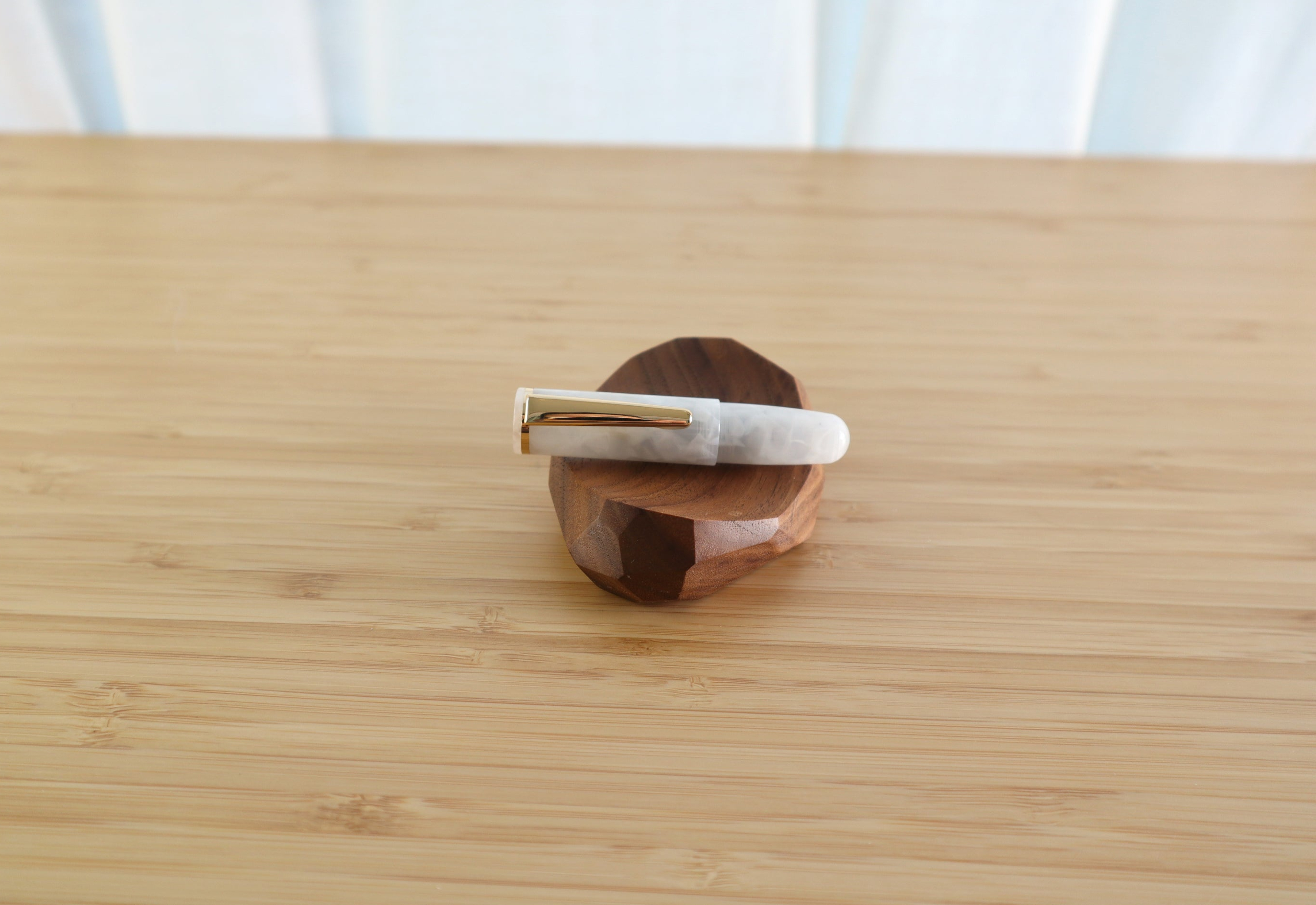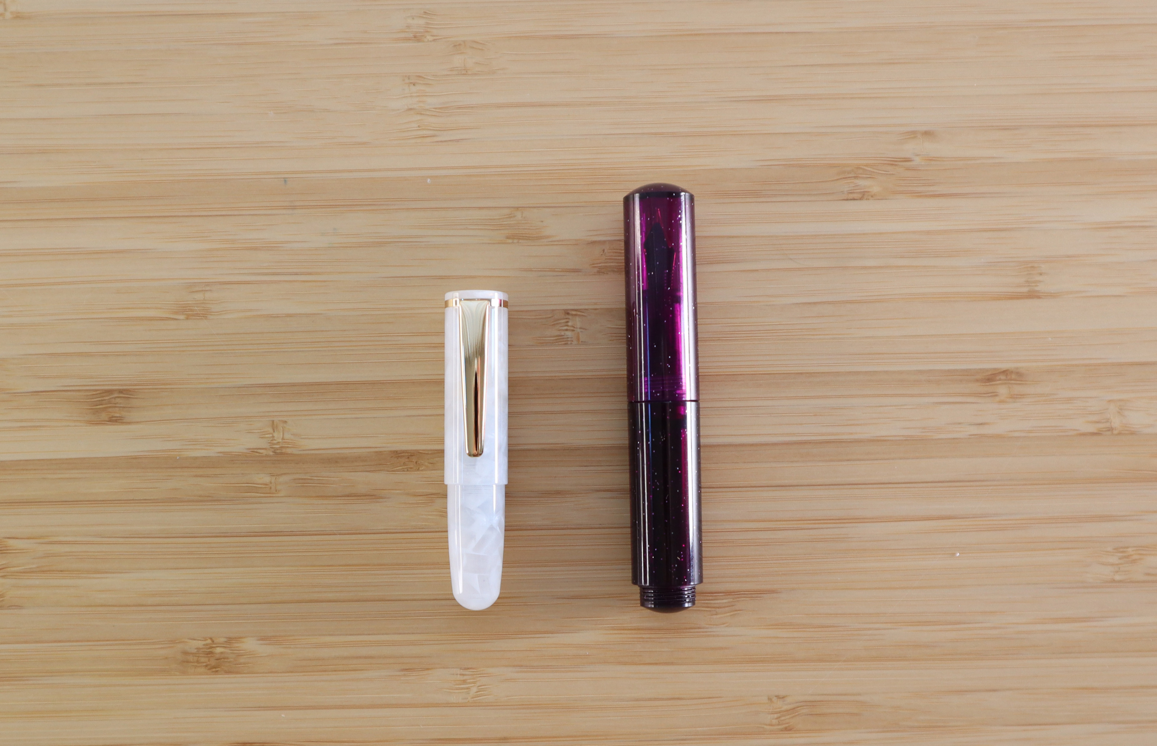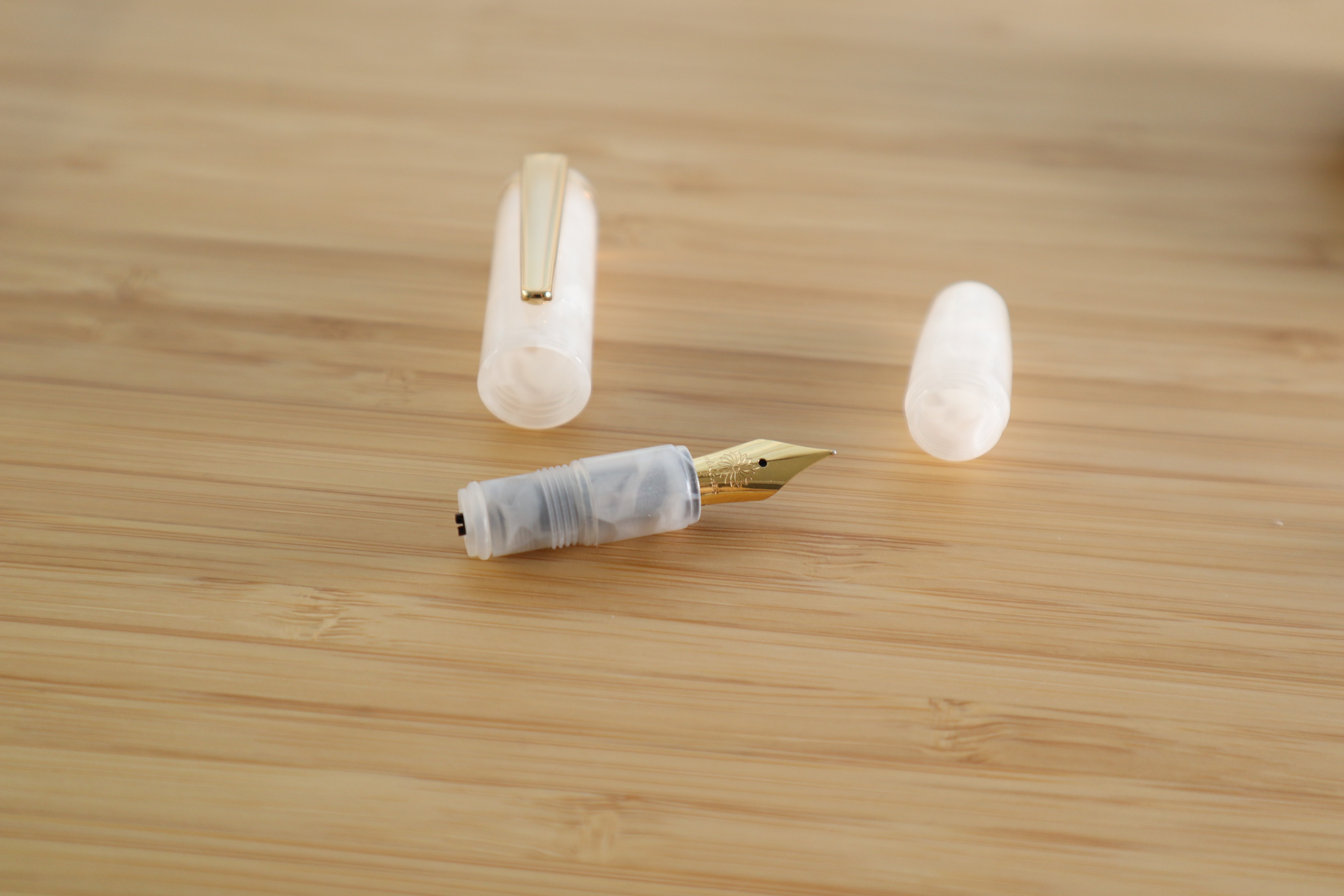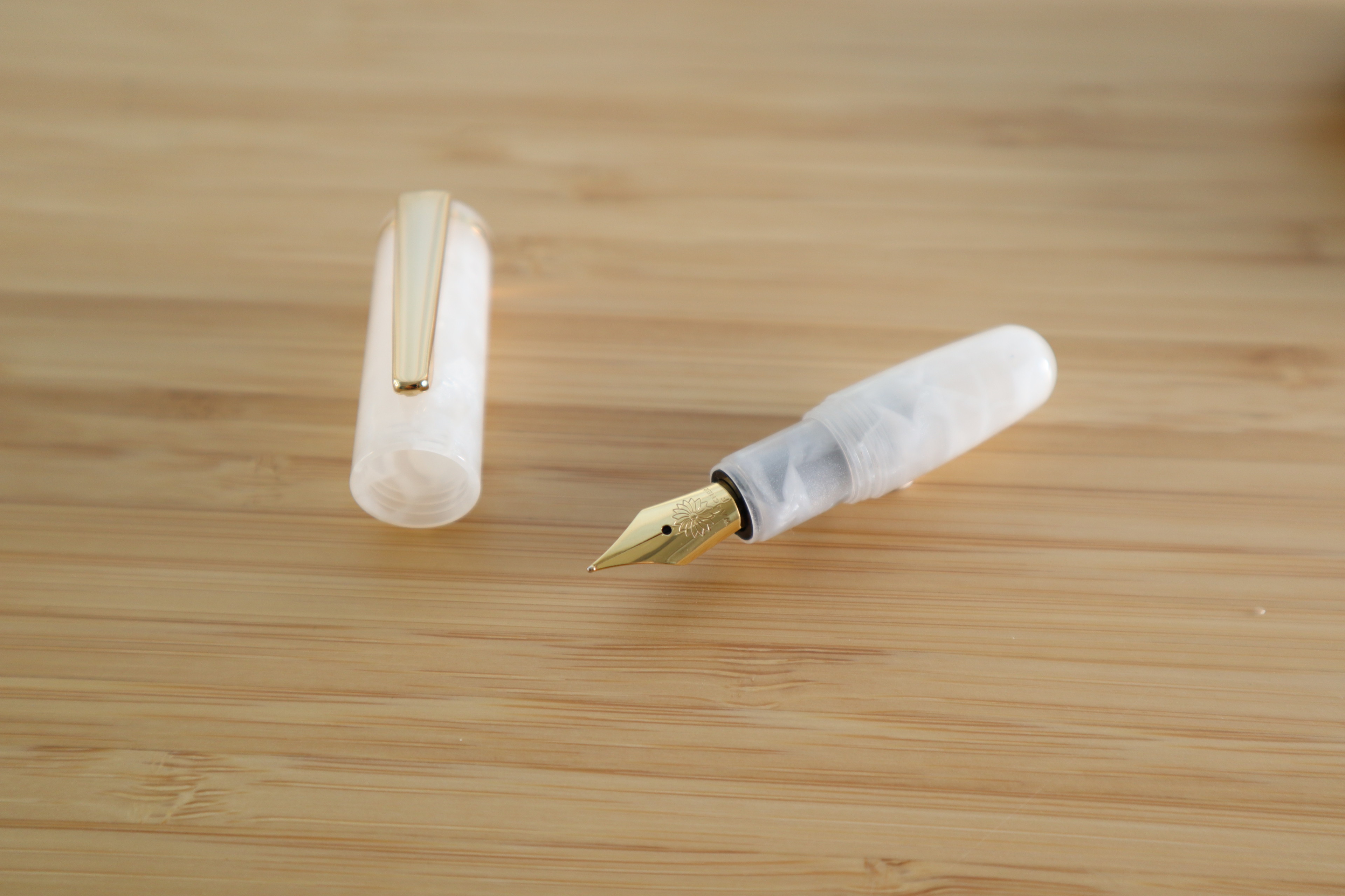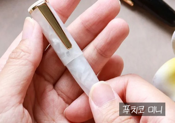 완처의 피치코는 레딧에서도 '세상에서 가장 귀여운 실용 펜'으로 불립니다. 제가 선택한 모델은 단순히 매끄러운 마블이 아니라, 하얀 아크릴 조각들이 겹겹이 뭉쳐진 듯한 패턴으로 되어있습니다. 닙은 5호닙이라고 하던데, 이 작은 만년필에 닙이 달려있는 것도 웃기네요. 8호닙과 비교했을 때 닙만 보면 작아 보이진 않아요. 다만 필기 시 캡을 뒤에 끼워야 하는데, 단단히 고정되지 않아 좀 불편합니다.