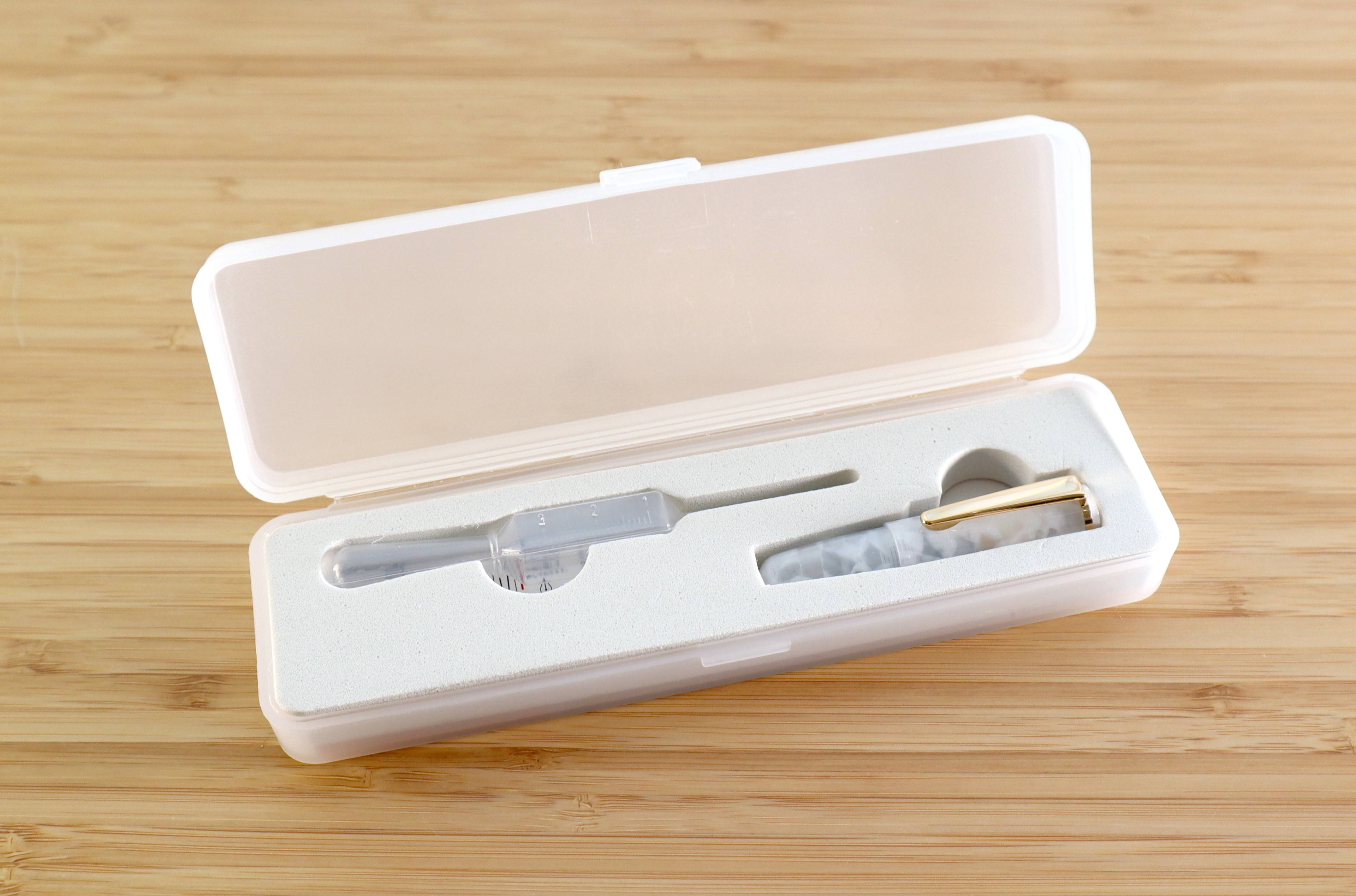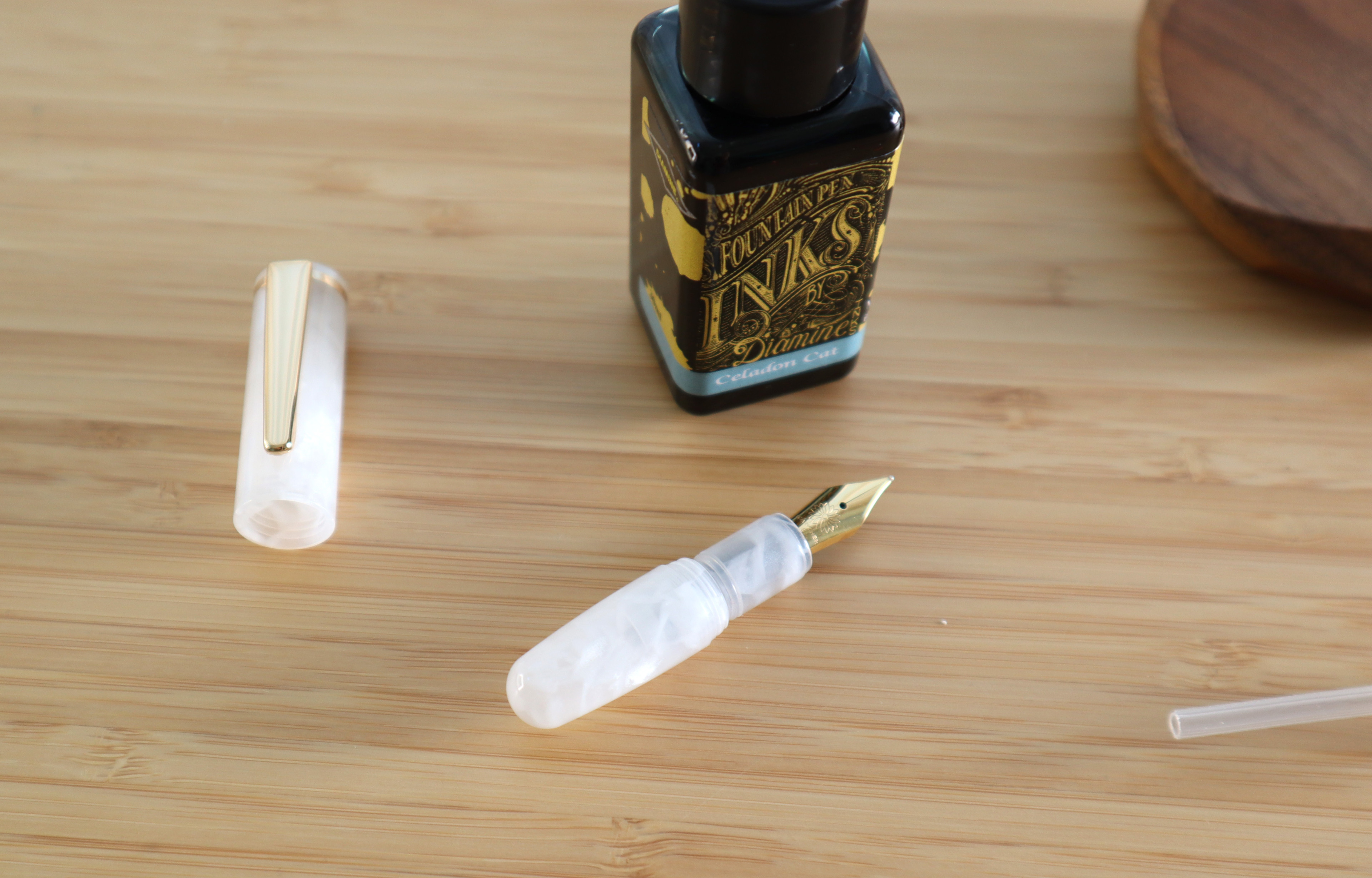 이 작은 펜은 컨버터가 들어갈 수 없기 때문에 '완차이' 만년필처럼 아이드로퍼 방식입니다. 덕분에 일반 컨버터 수준인 0.5ml의 잉크를 넣을 수 있습니다. 약간 아쉬운 점이라고 한다면 반투명 배럴에 잉크 색상이 비친다는 점입니다. 전 그냥 올 화이트가 좋은데 디아민 세라돈 캣을 넣었는데, 화이트가 아닌 게 되어버렸네요.