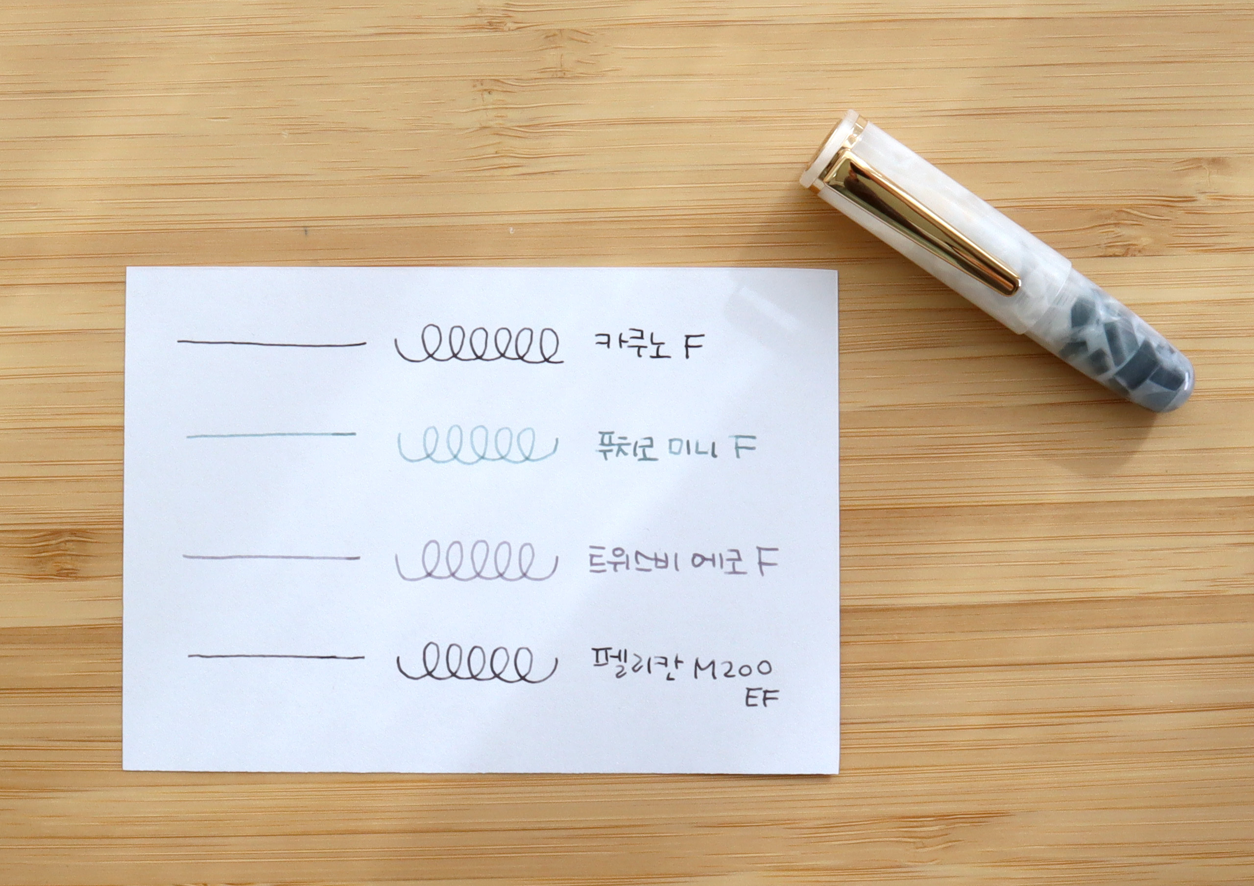 저는 F닙을 구매했는데, 전체적인 잉크의 흐름은 좋았어요. 헛발질도 없고 잘 농담도 표현될 만큼 풍부하게 잘 나왔습니다. 굵기는 카쿠노 F닙보다는 약간 굵은 느낌이고, 트위스비 에코 F와 비슷하거나 그것보다 흐름이 더 좋았던 거 같아요. 필기감은 완전 버터필감 이런 건 아니었지만 카쿠노보다 덜 사각거렸습니다.