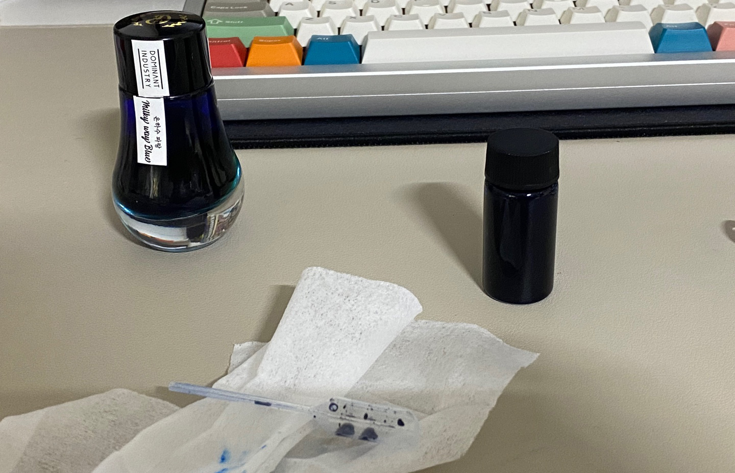 많은 분이 만년필에 입문하며 가장 먼저 꿈꾸는 로망이 있다면, 아마도 일반 펜에서는 결코 볼 수 없는 화려한 '테'와 반짝이는 '펄'이 가득한 잉크일 것입니다. 저 역시 그 로망을 실현하기 위해 고민 끝에 도미넌트 인더스트리의 '은하수 파랑'을 선택했습니다. 이 잉크는 짙은 파란색 베이스 위에 강렬한 적테가 뜨고, 그 사이로 은색 펄이 쏟아지는 것이 특징입니다. 25ml의 아담한 병 잉크를 받아들었을 때, 바닥에 가라앉은 촘촘한 펄 입자들을 보며 설레면서도 한편으로는 잦은 흔듦이 동반될 불편함에 긴장하기도 했습니다.
