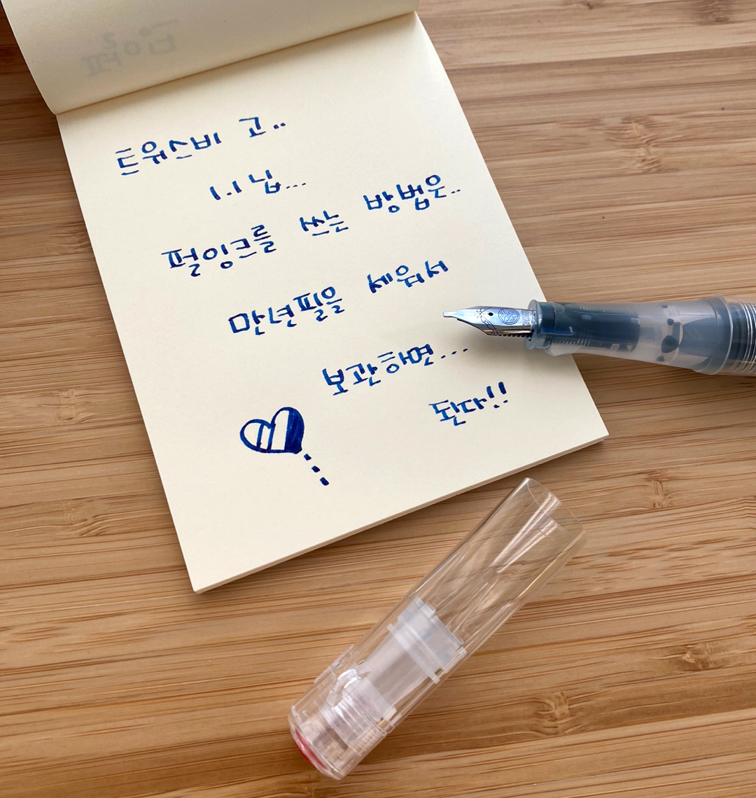 저는 펄 잉크를 넉넉하게 쏟아내기 위해 피드 구조가 튼튼하기로 유명한 트위스비 GO 1.1mm 스텁 닙을 선택했습니다. 하지만 실전은 생각보다 훨씬 가혹했습니다. 펄 입자가 피드를 막아버려 잉크가 아예 나오지 않거나, 반대로 한꺼번에 울컥 쏟아지며 파란 잉크가 줄줄 새는 난감한 상황이 반복되었습니다. 해외 커뮤니티의 사례를 찾아보니, 1.1mm도 훌륭하지만 이 잉크의 펄 밀도를 감당하려면 더 굵은 닙이 안전하다는 의견이 많더군요. 실제로 막힌 촉을 뚫기 위해 생수병을 옆에 끼고 수없이 씻어내는 시행착오를 겪어야만 했습니다.